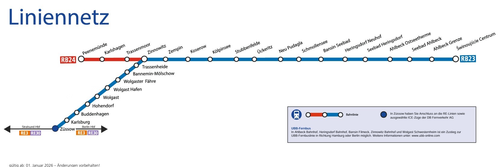 Bitte beachten Sie: Aufgrund der Verkehrsrechtsvergabe des Landes Mecklenburg-Vorpommern wird die Strecke Świnoujście – Züssow – Świnoujście von der UBB im Auftrag der DB Regio Nordost betrieben.